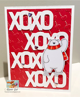 To create this card I used Love Hearts embossing folder by Bringing Crafts-Too you and XOXO die cut to create the background. The polar bear is from the Polar Bear Pals stamp set by MFT, colored with Copic markers. The gems were placed using the Imaginisce iRock tool.